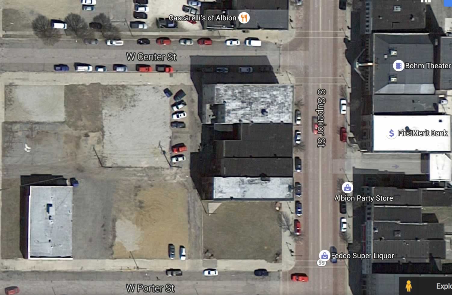 At left is the approximate location of the 9 million dollar project – approximately across from the Bohm Theatre and FirstMerit Bank drive thru in downtown Albion Michigan. The status of the buildings that are still left in this block is not known.