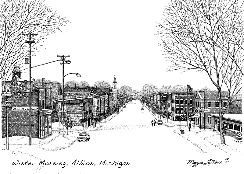 What has changed in Albion since 1985? This art of downtown Albion was posted to the Albion Michigan Arts group on Facebook.  People started to comment on the things that had changed.