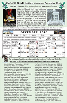 This General Guide shows some landmarks of both Albion and Marshall that were made possible through donations large and small. As the month goes by we will post more information about these landmarks including their history. We will be posting all of the events that are listed in the print version onto the web calendar at GeneralGuide.net so you will be able to get more information and click through to see the official source to verify times and locations before you make a trip.