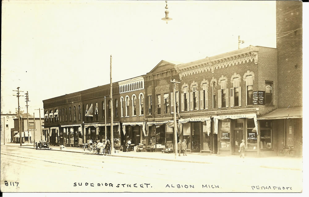 As you may know, I appreciate old Albion photographs and like to share them with our readers here. Occasionally yours truly comes across an old postcard of Albion I haven’t seen before. This week from our Historical Notebook we present a photo card from circa 1907 by the acclaimed photographer Pesha who went all over the state producing picture postcards. This scene shows the 101 side (east) of S. Superior St. from Cass St. southwards to what is today the Bohm Theatre location. During this time the interurban tracks went through the center of the street, as seen in this photo. Downtown Albion once contained numerous grocery stores, and several are found in this block alone.